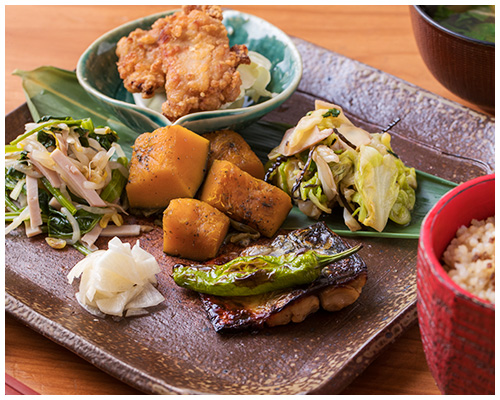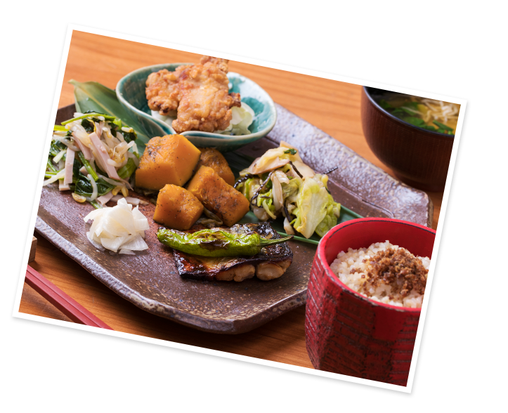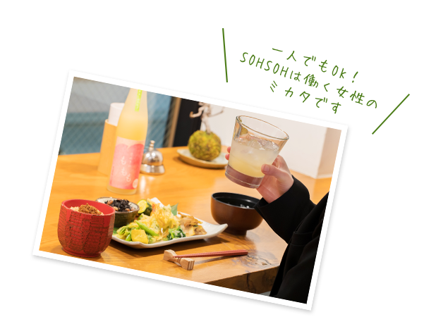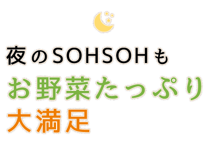高松、瓦町の夜カフェ「お野菜食堂 SOHSOH(ソウソウ) 丸亀町グリーン店」。お子様連れ家族の食事や女性おひとりの夜ご飯におすすめの野菜・サラダがたっぷりとれるヘルシー定食をご用意しております。季節のお野菜をふんだんに使用するアラカルトもご用意しておりますので、日本酒など美味しいお酒とお楽しみください。